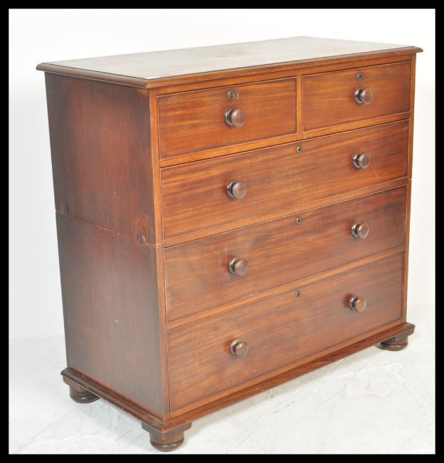 A rare 19th Century Victorian mahogany attic chest of drawers / chest on chest raised on bun feet. The bank of two over three drawers having Brammer locks with turned knob handles. Dismantles into two smaller chests for ease of transport.