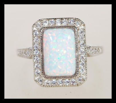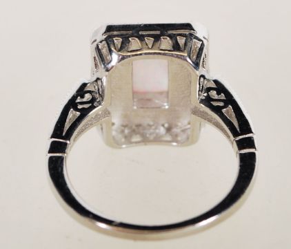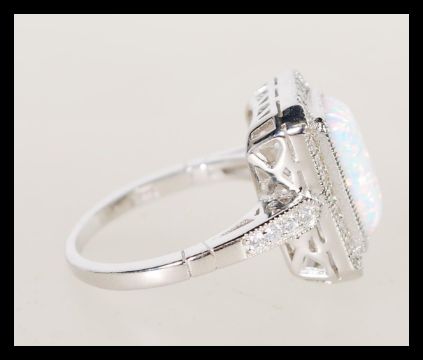 A sterling silver Art Deco style ring having a central opal panel and decorated with CZ stones. Weighs 8 grams size R.5.