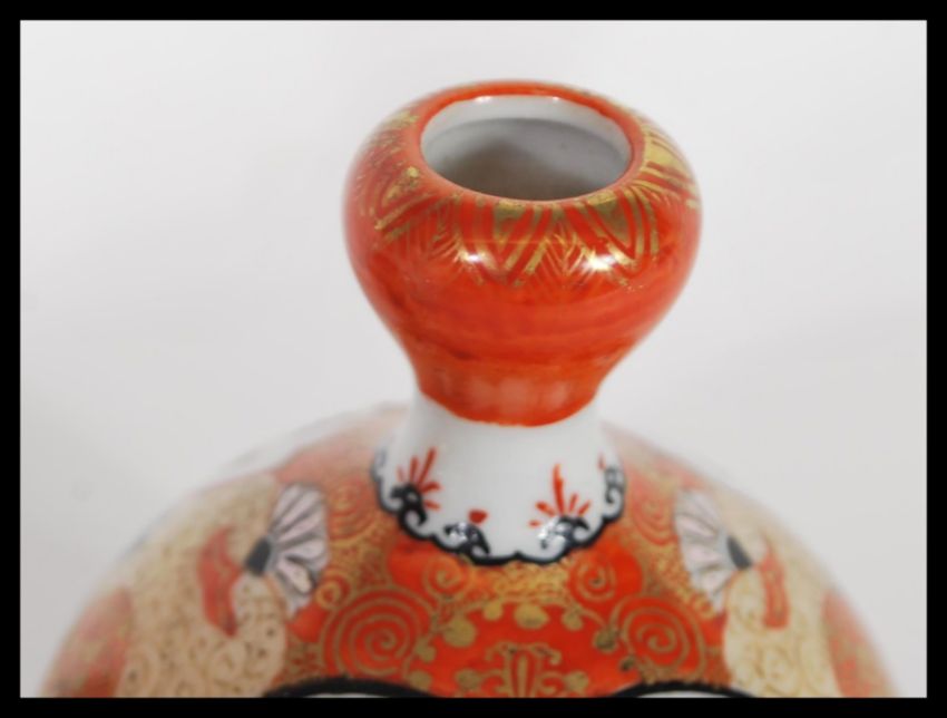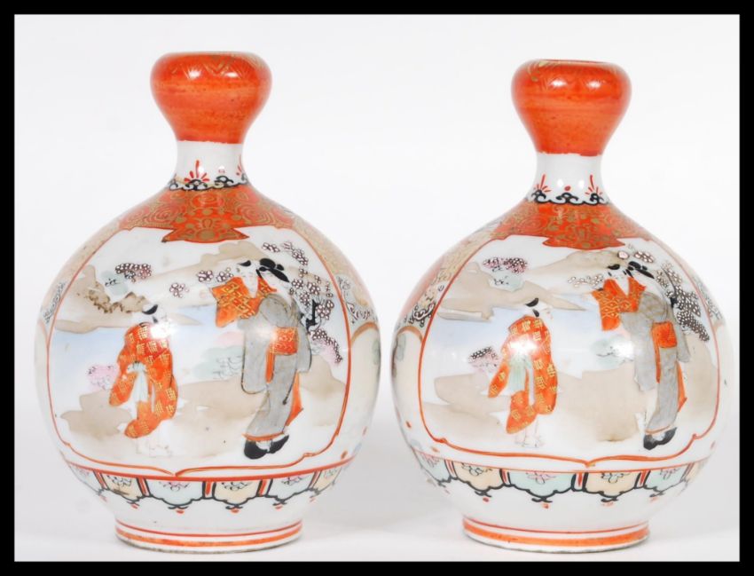 A pair of 19th century Japanese Oriental Kutani baluster vases with waisted necks having geometric borders and concentric circles to the foot depicting scenes of Geisha's and merchant men in cartouche panels with ochre red character marks to base. Measures 12cms high.