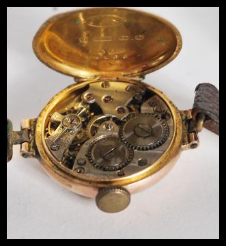 A 9ct gold hallmarked ladies wristwatch/ cocktail watch. Having a circular face with roman numeral chapter ring and leather strap. Hallmarked 375 birmingham. Gross weight 14.6. Face 22mm diameter.