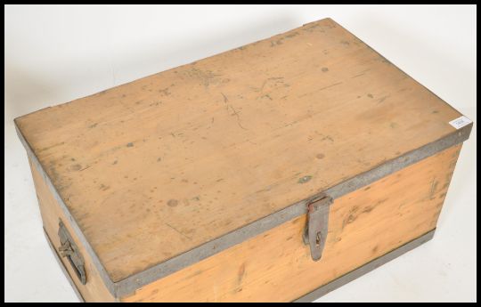 A 19th Century pine trunk coffer chest box having wrought iron drop handles and being wrought iron bound. The long rat tail hinged lid opening to reveal a spacious interior.