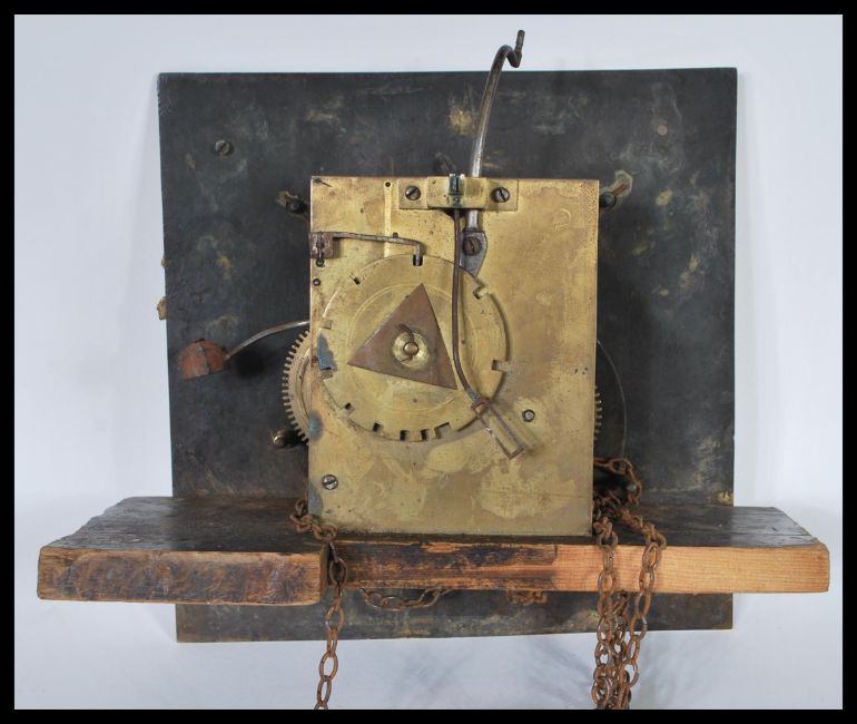 An 18th / 19th Century brass longcase clock movement, the brass face having a Roman numeral chapter ring with the name John Pike Newton Abbot spanning the chapter ring. 28cm high 28cm wide.