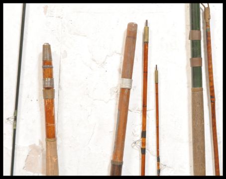 A collection of early 20th Century vintage split cane fly fishing rods some having cork handles along with a stained wood and brass reel stamped made in England and a canvas carrying case. Measures 29cm long.