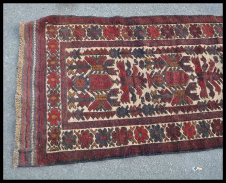 A 20th Century Persian Islamic knotted runner rug having a beige ground with red geometric patterning to the central panel and floral patterning to the border. Measures 350 x 84 cm.