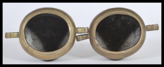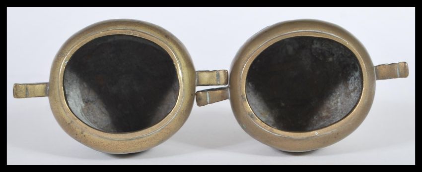 A pair of Chinese brass incense burners, each surmounted with the dog of Fo, and having panelled bodies with stylized birds and flora. 18cm high.