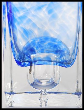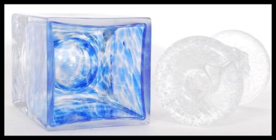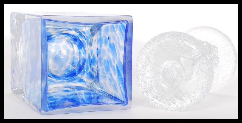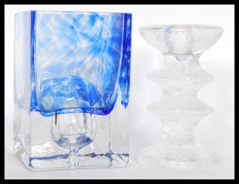 Two pieces of vintage studio art glass to include a  1960's Festivo Iittala ice textured glass candlestick and a glass heavy dump vase of square form with central bubble to base and blue decoration to sides and rim in the manner of Ronald Stennett Willson. Tallest 14cm high.