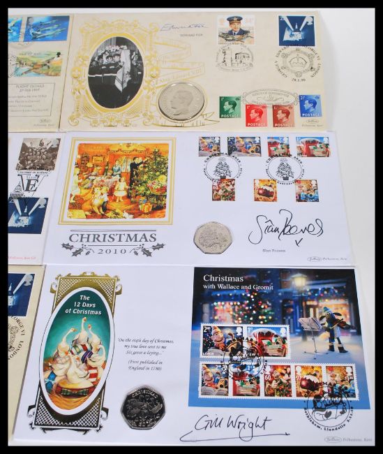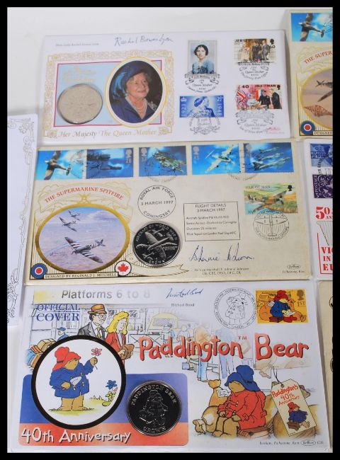 A collection of ten First Day Coin Covers to include military related, spitfire, Wallace and Gromit, Paddington Bear, Churchill etc. Mostly Crown examples with some decimal coin examples.