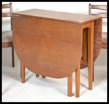 A retro 20th Century teak wood drop leaf gate leg dining table together with a set of four rail back teak wood dining chairs. Measures: 74cm high x 84cm wide x 35cm deep.