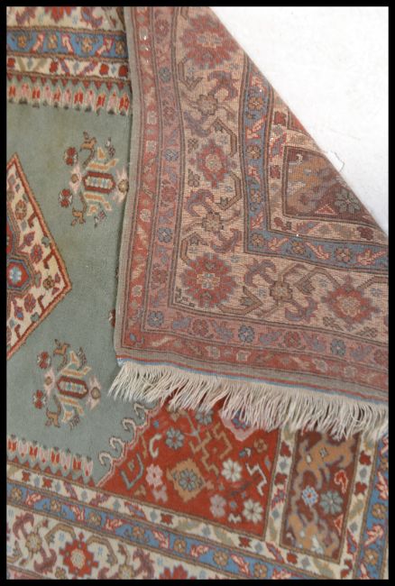 A 20th Century Persian Islamic rug having a red ground with a beige main border with geometric floral patterning within, the central field having a large green panel with a central medallion. Measures 192cm high x 132cm wide.