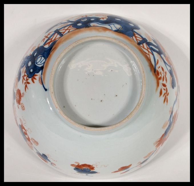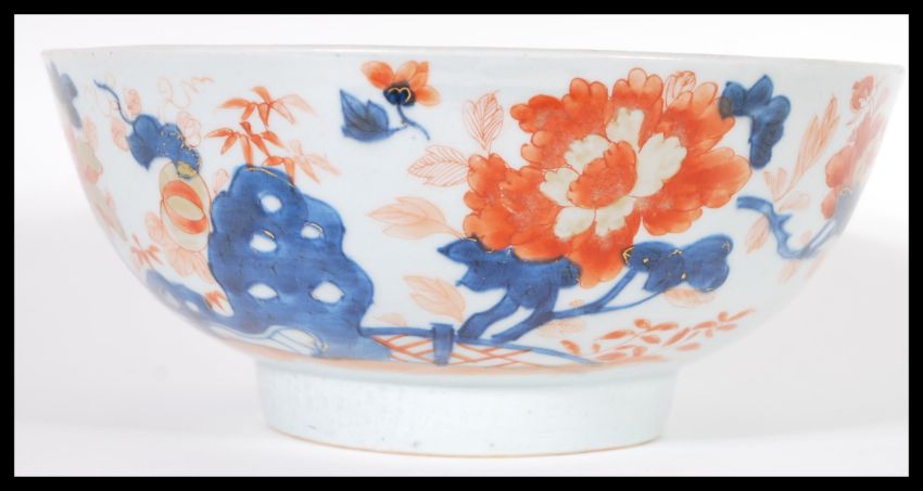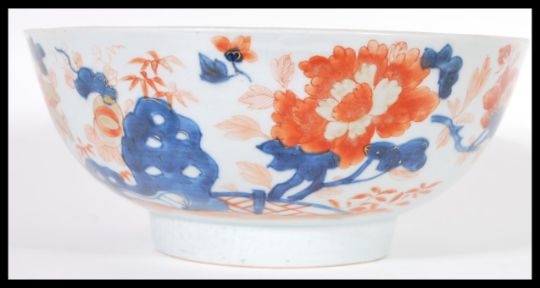 An 18th Century Chinese Imari pattern centerpiece bowl having hand gilded decoration with central floral spray to the well of the bowl. Raised on a small circular foot with painted decoration. Measures 10cm high by 24cm across.