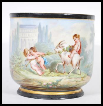 A 19th Century Jardiniere / garden pot having a hand painted classical garden scene with playful cherubs and gilt rims. Measures 18cm-high 19cm-diameter.