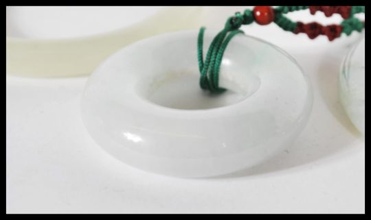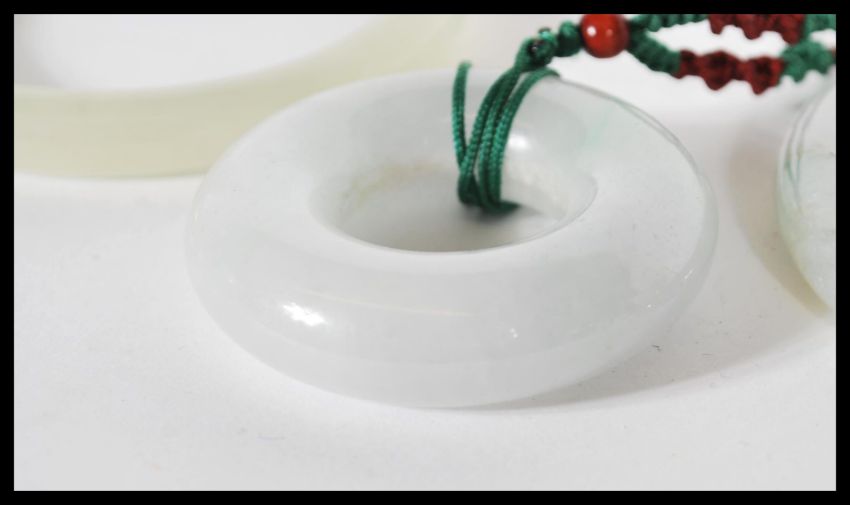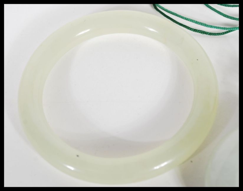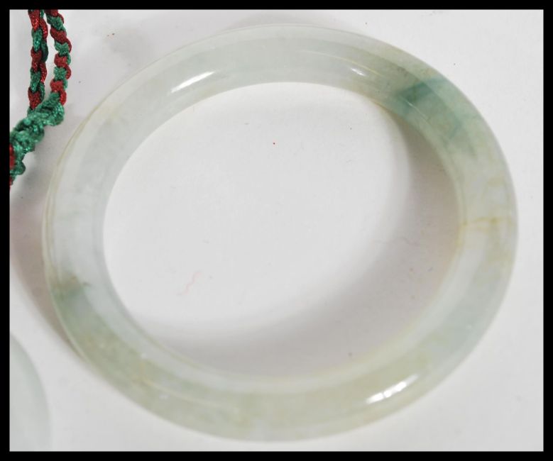 A group of Chinese green jade / green stone jewellery to include necklace pendant of roundel form on string necklace and two green jade bangles of typical form.