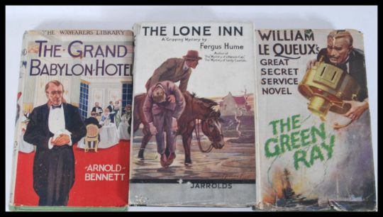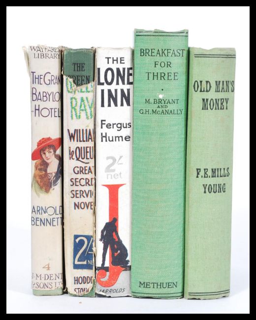 A selection of early 20th Century novels to include ' The Grand Babylon Hotel' by Arnold Bennett published by Dent & Sons (1920), 'The Green Ray' by William le Queux published Hodder & Stoughton, ' The Lone Inn ' by Fergus Hume published by Jarrolds, ' Breakfast For Three ' by M. Bryant and G. H. Mcanally published by Methuen & Co (1930) first edition and 'Old Man's Money by F. E. Mills Young published by Hutchinson & Co.