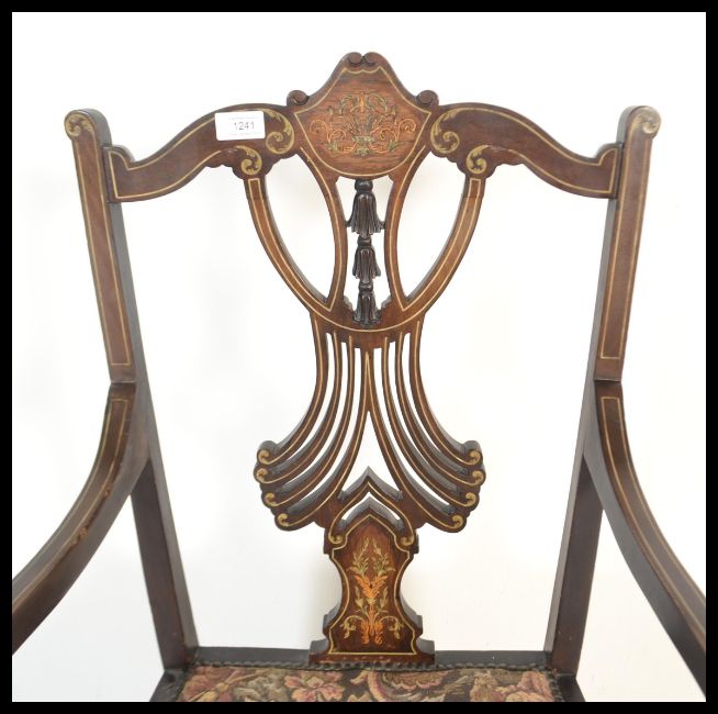 An early 20th Century inlaid mahogany elbow chair, with pierced fan slat back, shaped arms with upholstered studded seat pad raised on cabriole supports. Measures: 96cm high x 54cm wide x 46cm deep.