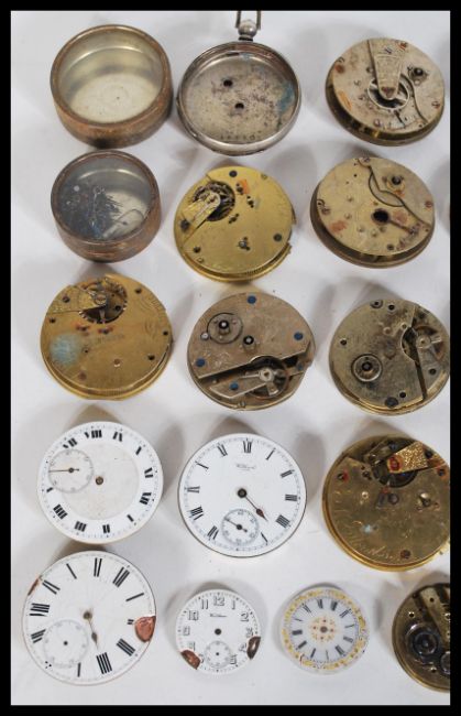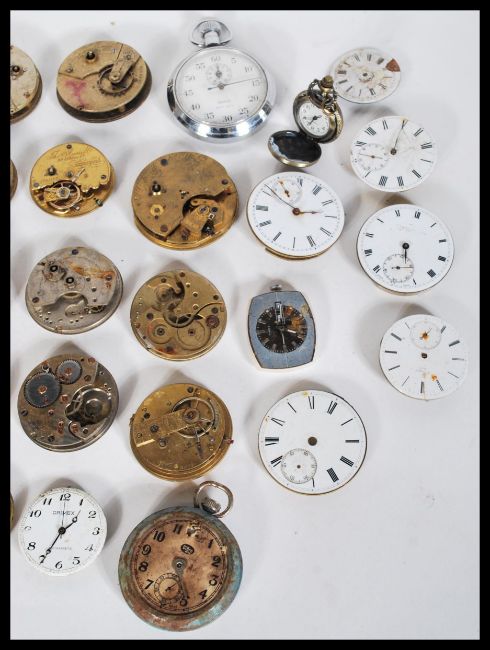 A collection of vintage 20th Century pocket watch parts, movements, faces and spares to include various styles and makes.