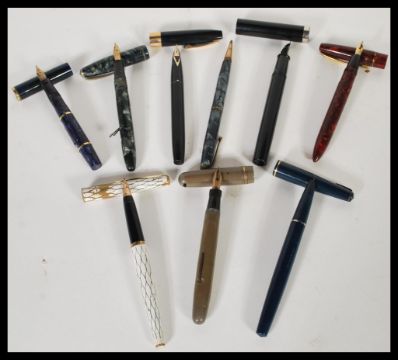 A collection of vintage 20th Century fountain / ink pens to include Parker, Conway Stewart, Shaffer etc most with 14ct gold nibs together with a propelling pencil.