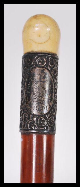 Two walking sticks to include an early 20th Century malacca walking stick having a silver collar and ivory handle to the top along with a hawthorn walking stick. 95cm long.
