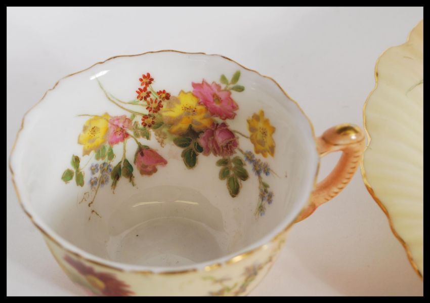A Royal Worcester Ivory blush matched trio having chintz foliate pattern. The cup with puce mark dated 1916 with RD NO 190547, saucer for 1918 and plate for 1922. Big Plate measures 21cm across.