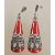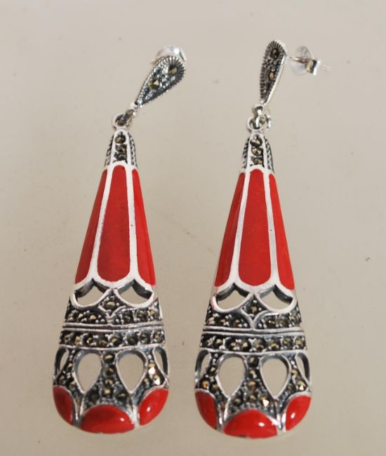 A pair of sterling silver Art Deco style drop earrings having marcasite and red enamel set drops. Weighs 14 grams.