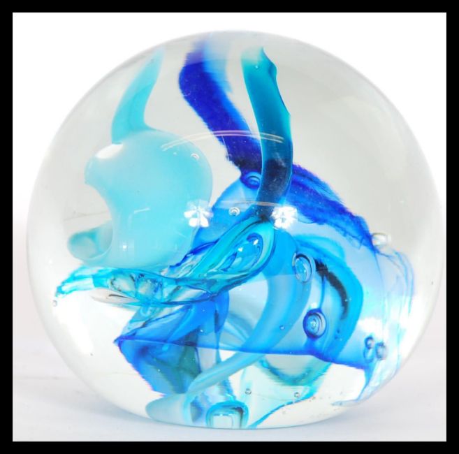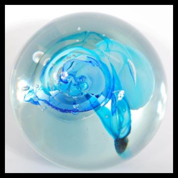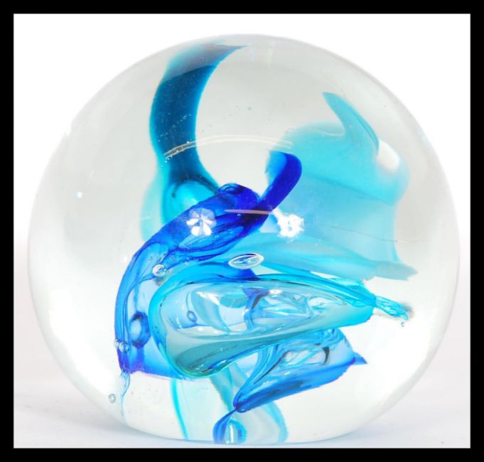 A vintage mid 20th Century studio art glass large paperweight having bubble control central design with shades of blue. Signed to base. 10cm high.