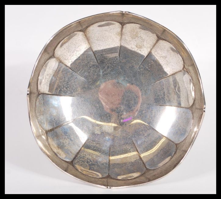 A silver hallmarked pedestal bowl, the scalloped bowl raised on a pedestal base etched to the inside of the base with retailers mark for Boodle and Dunthorn, Lord St Liverpool. Approximate weight 400g. H14cm x 19cm diameter.