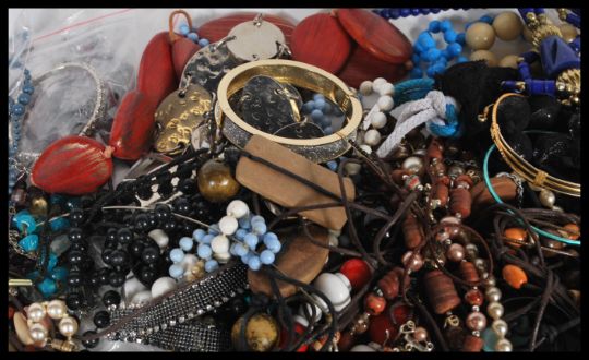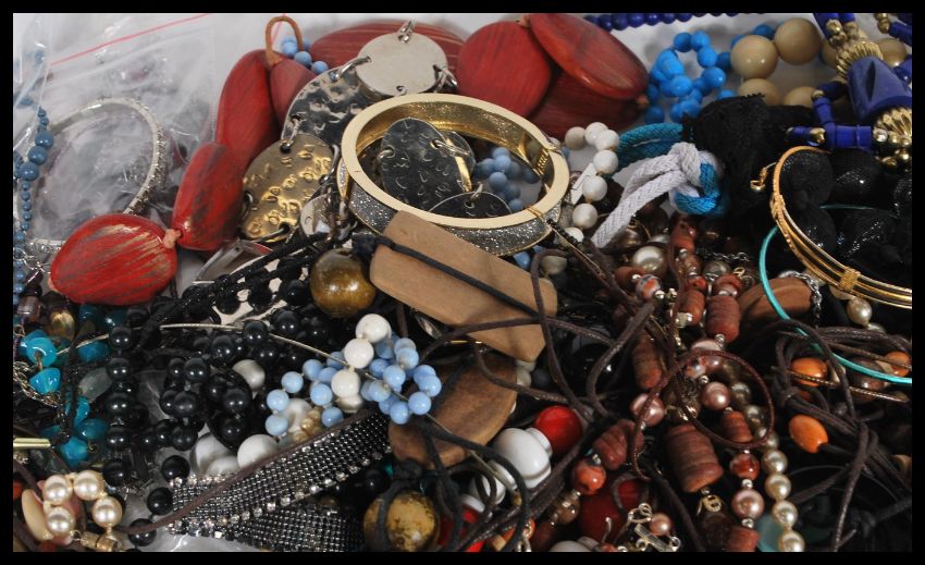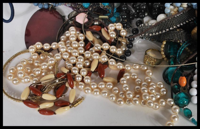 A selection of vintage costume jewellery to include beaded necklaces including faux pearls, bangles, spacer bracelets, wooden bead necklaces, glass bead necklaces etc.