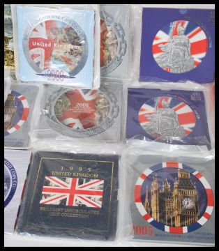 A collection of commemorative British uncirculated coin sets, all coins remaining in original packaging