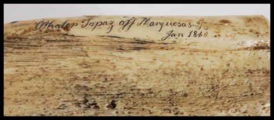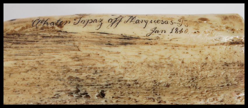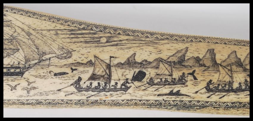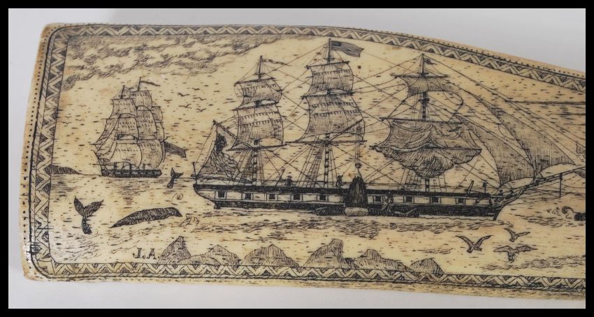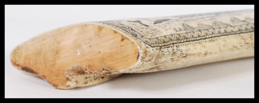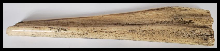A 20th Century resin scrimshaw whale bone replica engraved with a whale hunting scene to the front, marked james Allen to the back. 43cm long.
