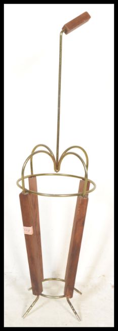 A retro vintage mid 20th Century teak wood and brass stick stand in the form of an umbrella together with a Moroccan patchwork leather pouffe ( with no filling )
