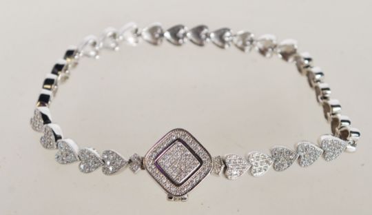 A sterling silver bracelet having heart shaped links decorated with CZ stones. Weighs 14 grams.