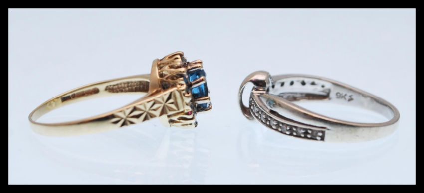 Two hallmarked 9ct gold ring to include a gold ring set with an oval cut blue stone and a halo of white stones and engraved decoration shoulders ( hallmarked Birmingham, size K.5 ) along with a white gold cross over ring set with white stones ( hallmarked London, size M.5 ). Total weight 4.3g.