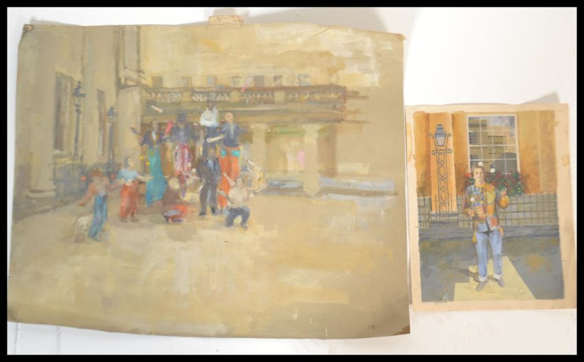 Covent Garden London - Two 20th Century paintings on paper depicting street acts in Covent Garden Market including a small acrylic on paper study of a juggler along with a larger oil on paper in the style of Bruce Yardley depicting a group of street jugglers. Both paintings unsigned. Measures: 42cm high x 55cm wide.
