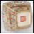 A Chinese Qianlong mark vase on stand. The bulbous square vase having hand painted scenes of court with famille rose decoration on gilt ground. White cartouche panels depicting rose medallions and butterflies. Set on matching stand. Both stand and vase having ocher red character marks. Measures 36cm-high.