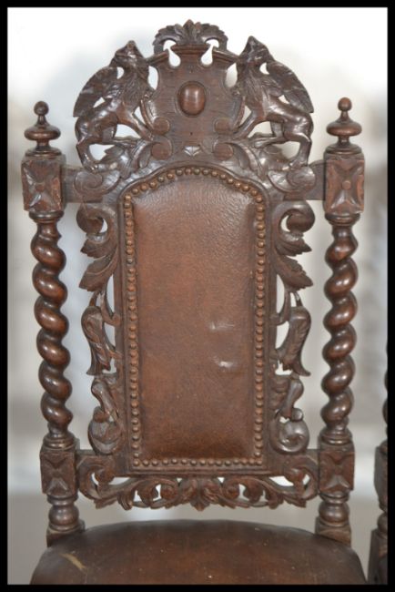 A set of four late 19th Century Victorian carved oak dining chairs in the Carolean style, each with pierced carved top rail containing an armorial shield flanked by Griffins, overstuffed seat pads upholstered in a rexine leather affect material with stud detailing, the central backrest panel upholstered in the same manner flanked by flanked by barley twist columns, raised on barley twist uprights united by stretchers. Measures 112cm high x 48cm wide x 45cm deep.
