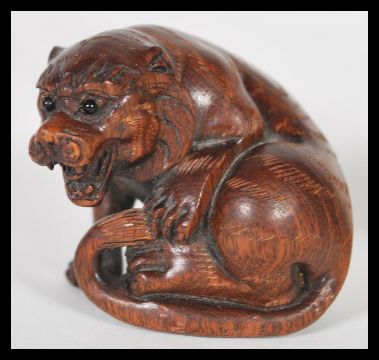 An early 20th Century Chinese bronze of a scholar together with a carved wooden netsuke of a tiger with character marks to base. 7cm high tallest.