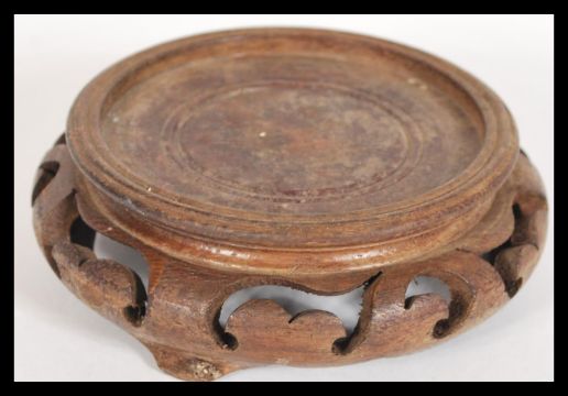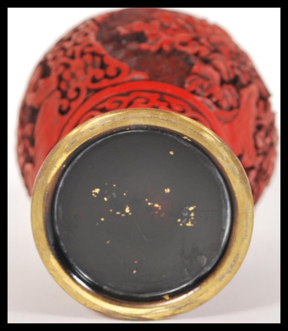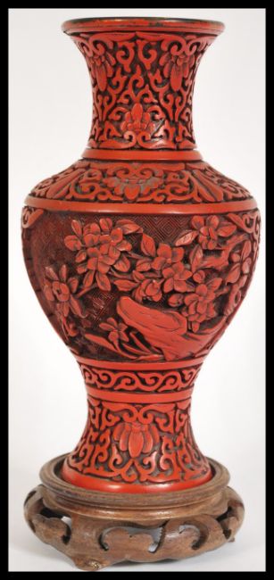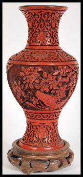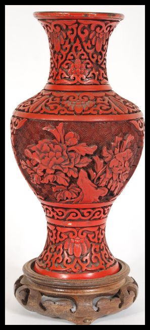 An early 20th Century Chinese Cinnabar Lacquer vase of baluster form having deep carved decoration of flowers and scrolls raised on wooden socle base. Measures 24cm high on stand.