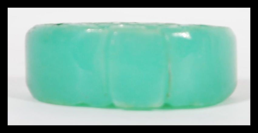 A 19th Century Chinese Jade bi disc snuff or perfume bottle of circular form with character marks and scrolled decoration. Complete with stopper. 5cm high 5cm diameter.