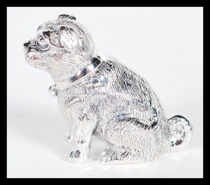 A sterling silver figurine in the form of a dog modelled in a seated position. Weighs 19 grams.