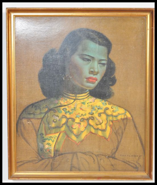 A vintage retro mid 20th century Vladimir Tretchikoff print on board of The Green Lady, also known as Chinese Girl being set in vintage gilt frame. Measures: 60cm high x 50cm tall.