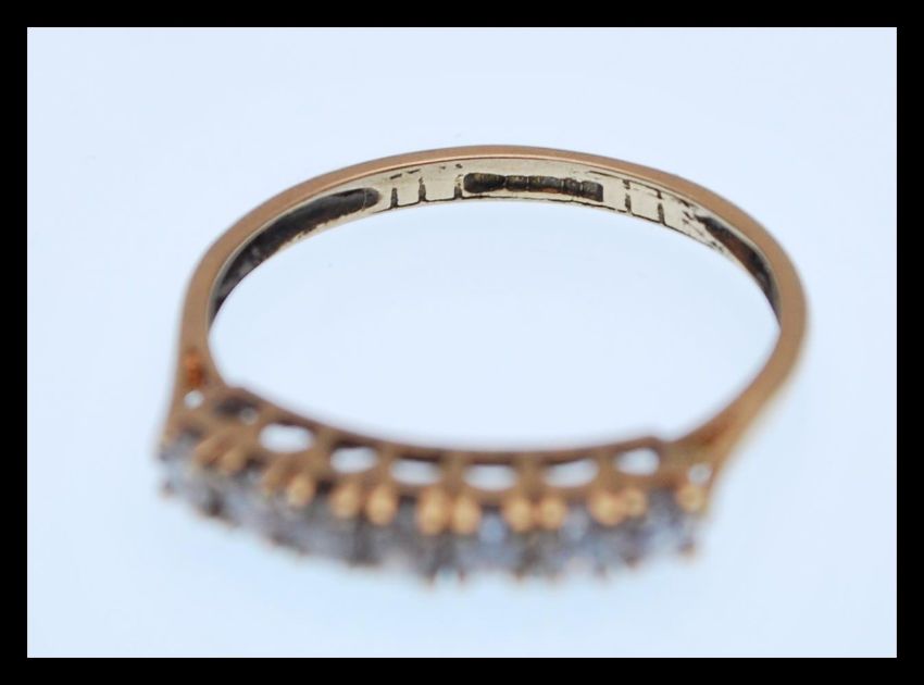 A hallmarked 9ct gold ring set with seven white stones (hallmarked Birmingham, size Q) along with a solitaire ring set with a white stone in a decorative setting (size L.5). Total weight 3.3g.