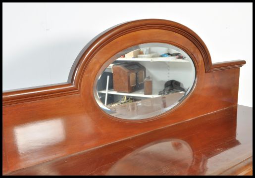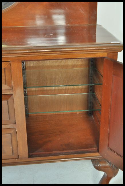 An Edwardian mahogany mirror back sideboard dresser being raised on claw and ball feet with a central bank of drawers flanked by end cupboards, above a mirror back gallery upright. Measures: 147cm high x 152cm wide x 53cm deep.