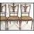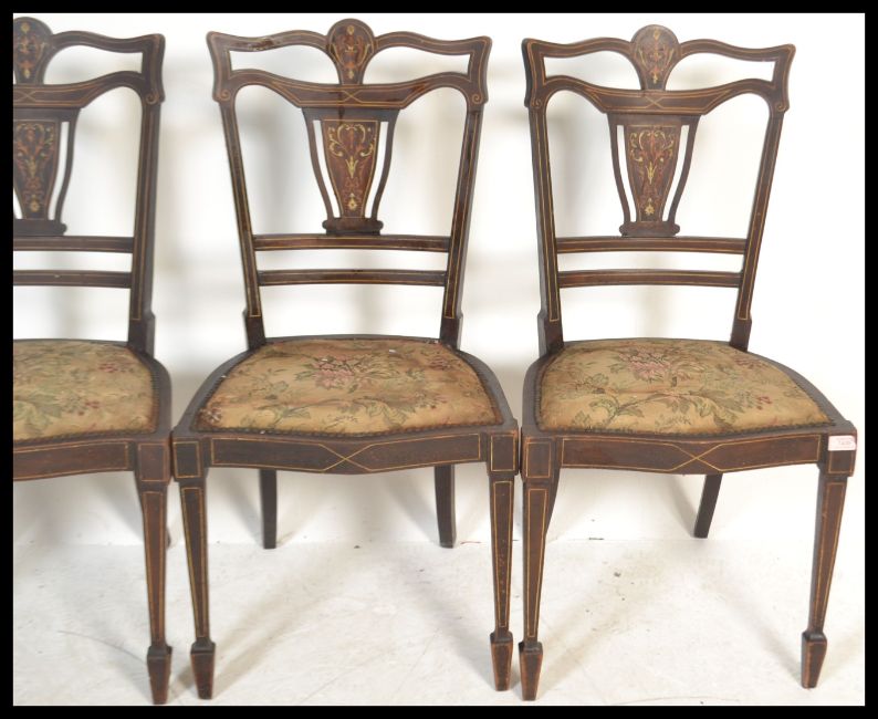 A set of four Edwardian marquetry seaweed inlaid mahogany dining chairs being raised on square tapering legs with spade feet having pad seats. Above, vase shaped back rests with scrolled top rails, the central vase panel with sea weed inlaid detailing. Measures 87cm high x 46cm wide x 42cm deep.