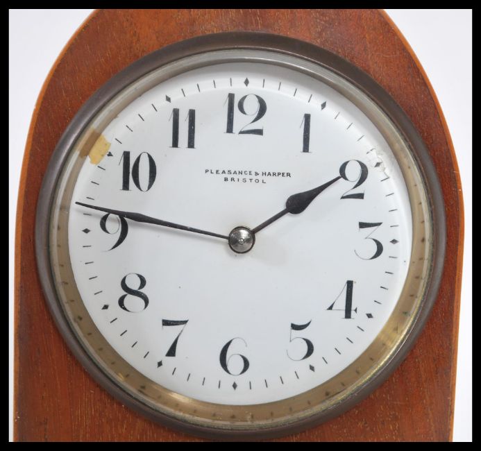 An Edwardian mahogany inlaid spire shaped mantel clock with enamel dial being marked for Pleasance & Harper, Bristol. 21cm high 14cm wide.