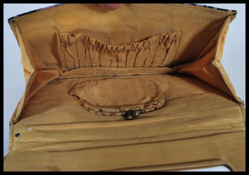 An early 20th Century Chinese silk embroidered clutch bag, embroidered with a ho ho bird and flowers together with a 1920's Art Deco ladies belt and buckle. 13cm high 21cm wide bag.