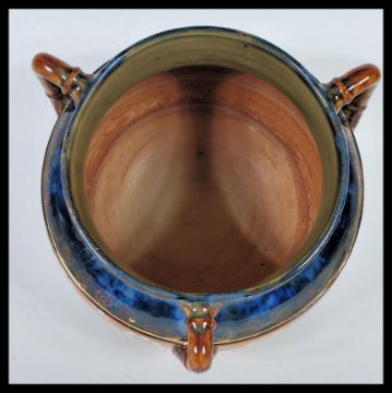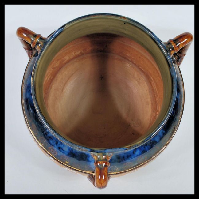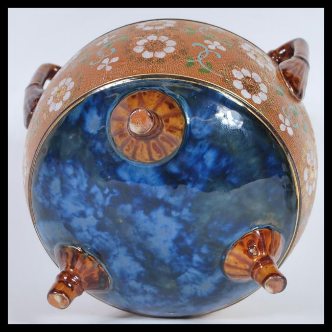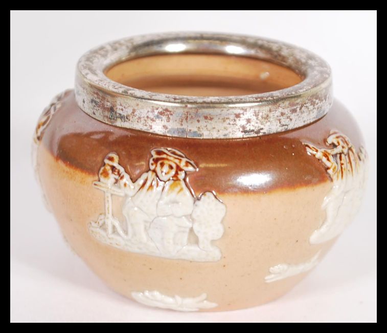 A Doulton Lambeth Slaters patent three handled pottery planter, of cauldron form painted in colours and gilt with a textured central floral band, set beneath a mottled blue / green neck and gilt lined rim raised on three stub supports bearing impressed mark to the inside. Together with a silver hallmarked collar Doulton harvest salt. Biggest 18cm high by 20cm diameter.
