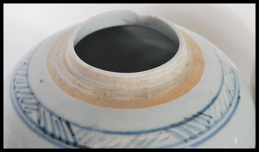 A pair of 19th century blue and white Chinese ginger jars. Simple form with scenes of village and fishermen, singular character marks to the base. 15cm high.