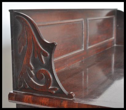 An early 19th Century flame mahogany bookcase cabinet having scrolled gallery top with brass lined door. Knob handle to front of door that opens to reveal a fitted interior with shelves.