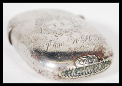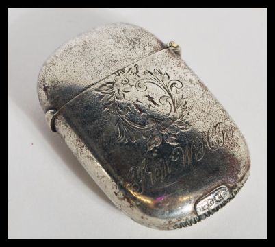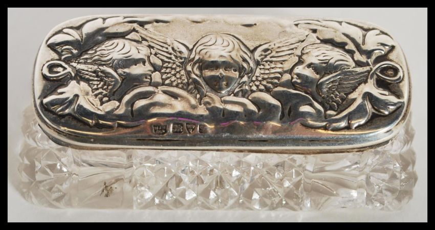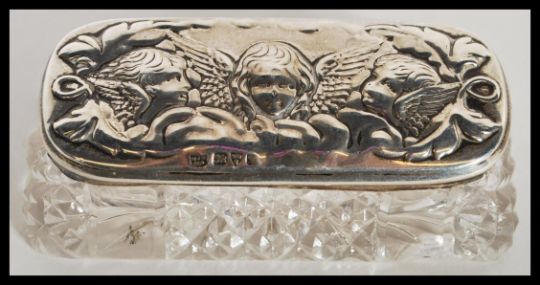 A silver hallmarked lidded cut glass dressing table trinket pot having relief decoration of cherubs along with a silver white metal vesta case. The pot hallmarked for Chester. 3cm high 9.5cm wide.