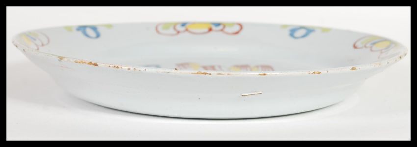 An 18th Century English Delft pottery charger plate of circular form having hand polychrome painted with central floral decoration and floral sprays to the border.