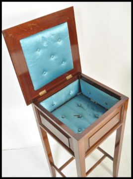 An Edwardian mahogany pedestal sewing box being raised on squared legs with hinged top enclosing contents. Measures: 76cm high x 38cm wide x 38cm deep.